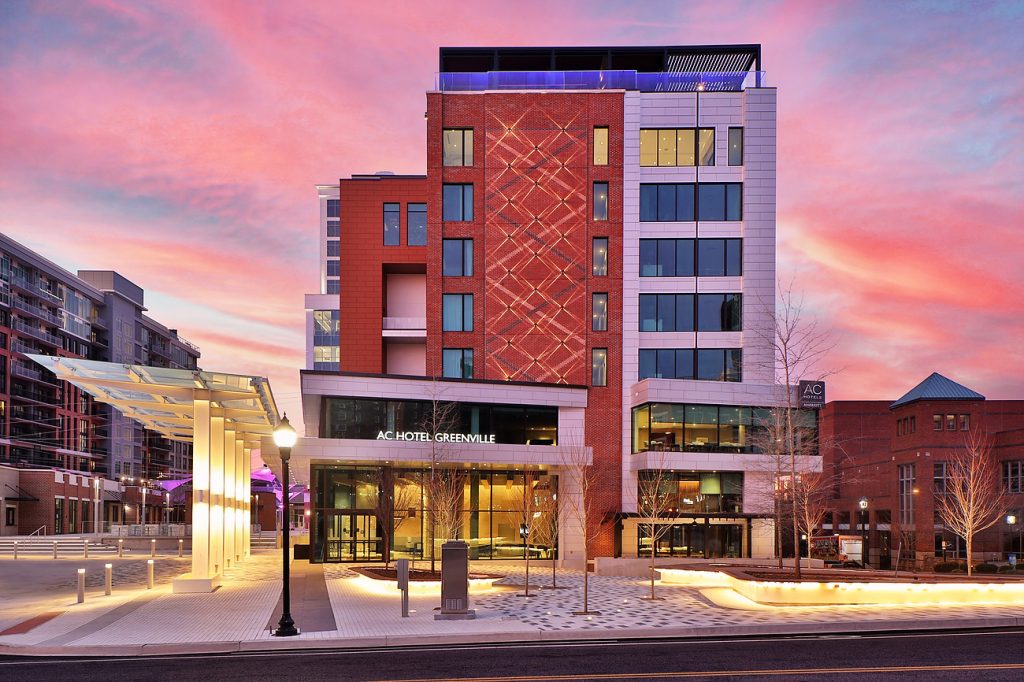 The state-of-the-art AC Hotel Greenville sits at the corner of Broad and Main Streets in downtown Greenville, South Carolina. With a purpose to elevate the guest experience in hospitality, the AC Hotel Greenville features a well-designed lobby area, flex spaces, five restaurants including a rooftop bar, all curated with local art.