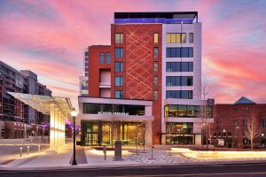 The hotel building design called for various Kawneer systems, including Trifab® 451UT Framing System, 1600 Wall System®1 Curtain Wall, 350 Medium Stile Entrances and more.