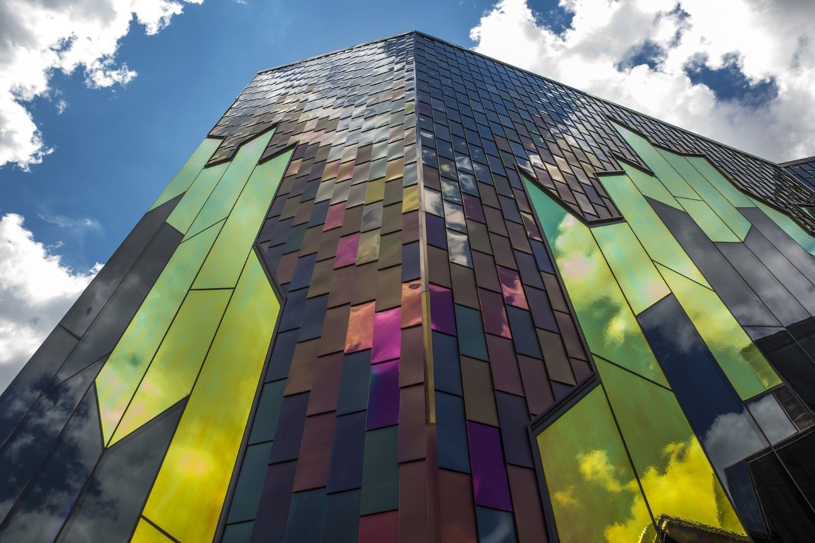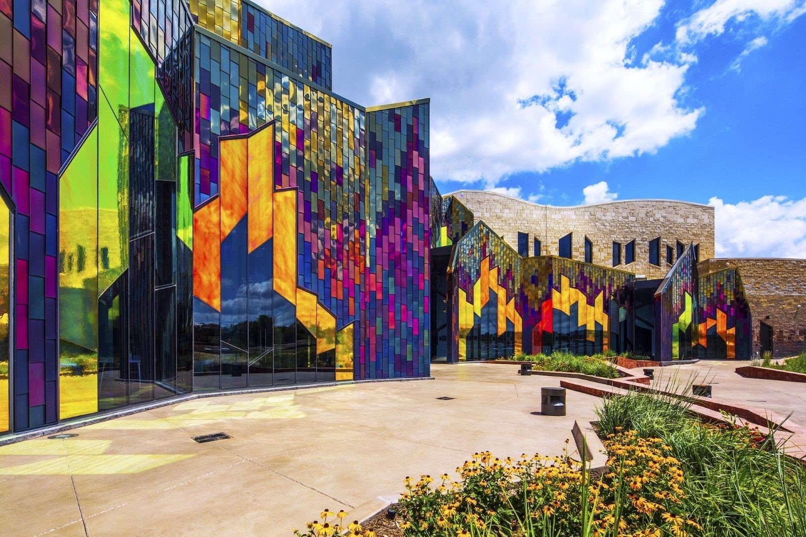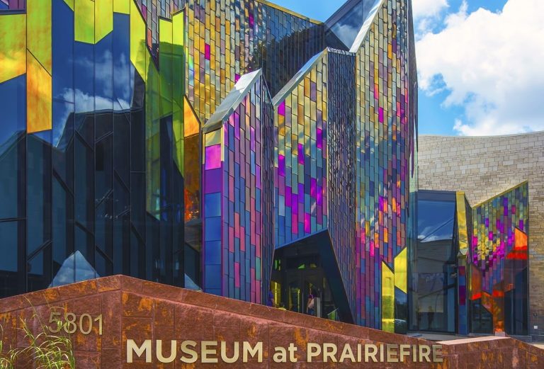 Distinguishable by its iridescent glow, the Museum at Prairiefire is designed to be as visually distinctive as the cutting-edge, world-renowned exhibits that it features. Complemented with crisp corners, this is the only building in the United States to feature dichroic glass, whose vibrant rainbow of colors achieve the iconic flame-like design inspired by controlled prairie burns.