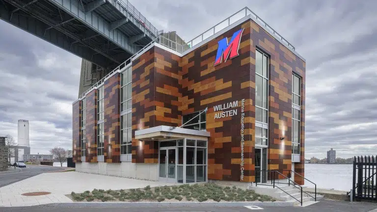 The William Austen Marine Education and Seamanship Center at SUNY Maritime College features a variety of Kawneer’s architectural aluminum systems, including our 1620UT Curtain Wall System, Trifab® VersaGlaze® 451T Framing System, AA®250 Thermal Entrances and 250T Insulpour® Thermal Entrances.