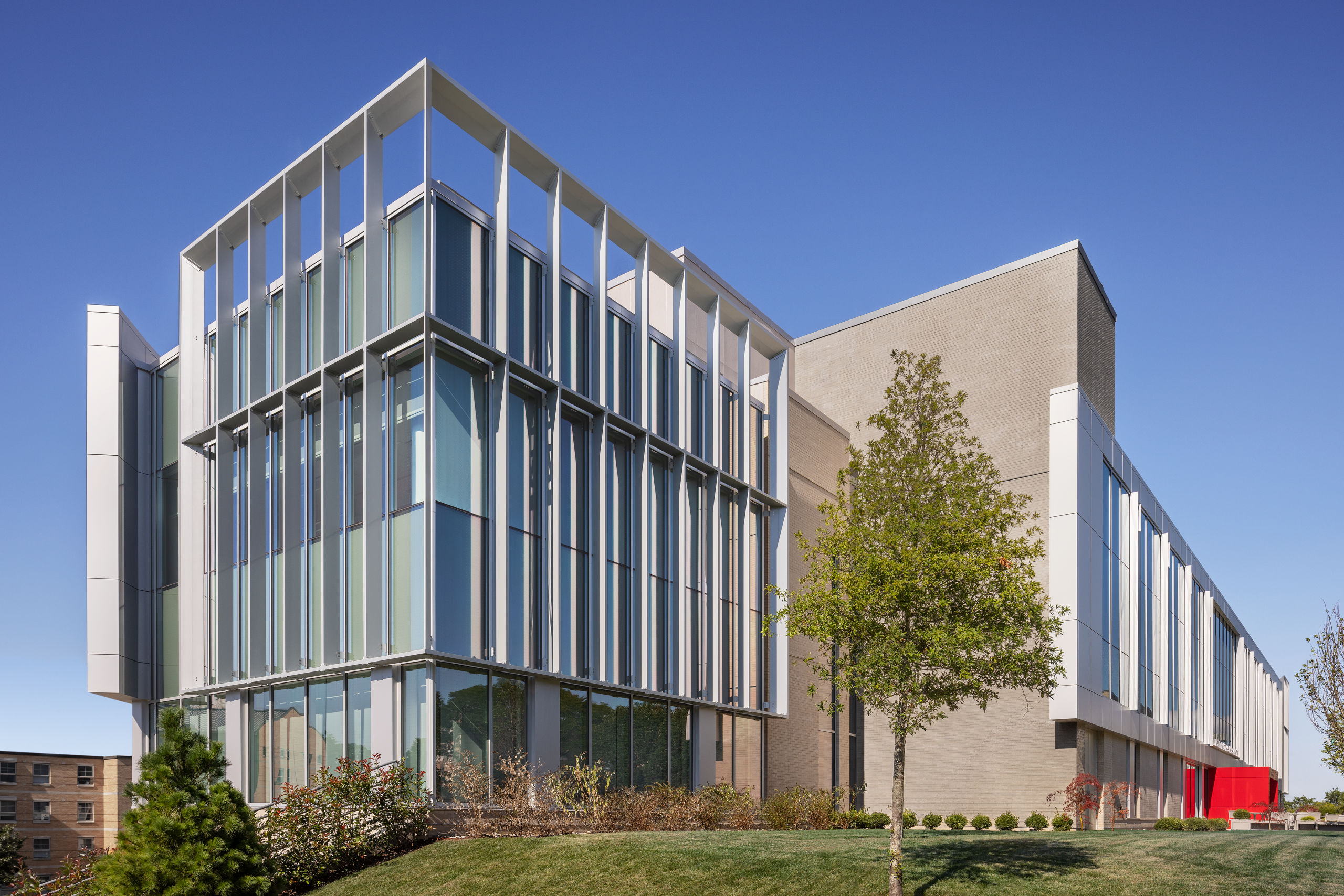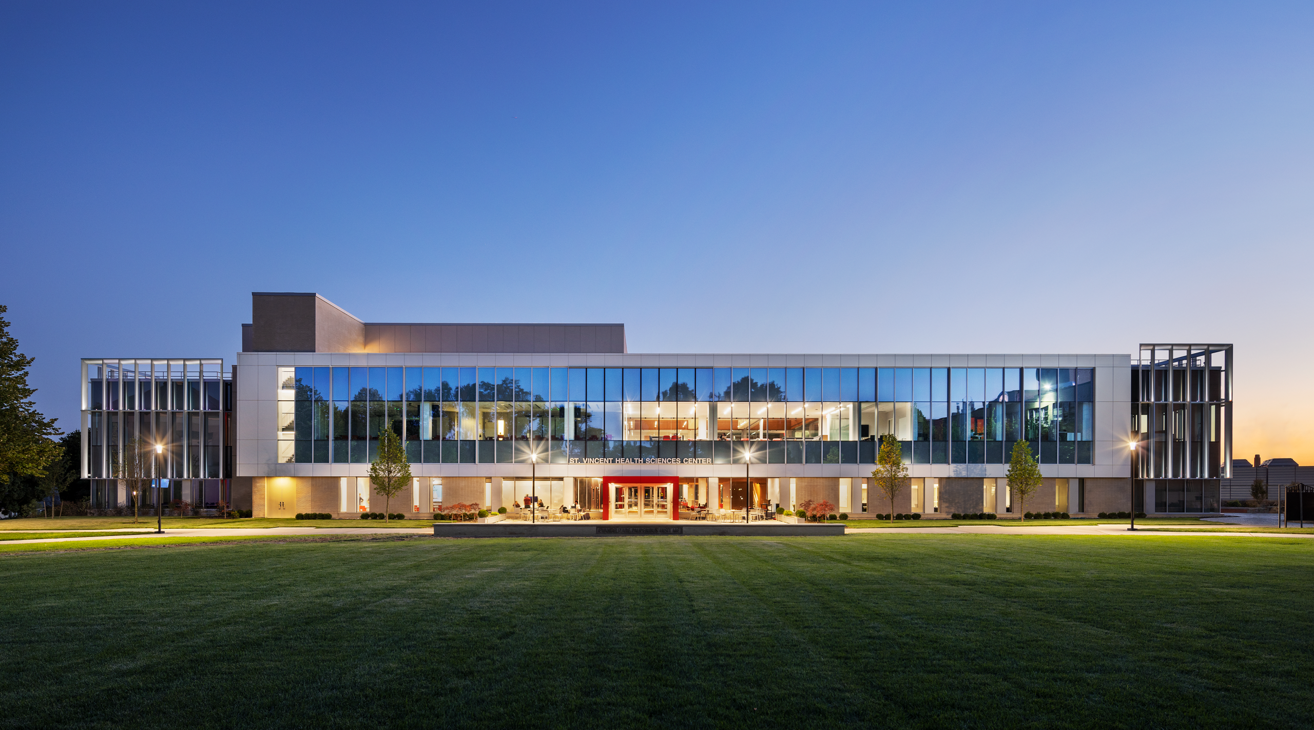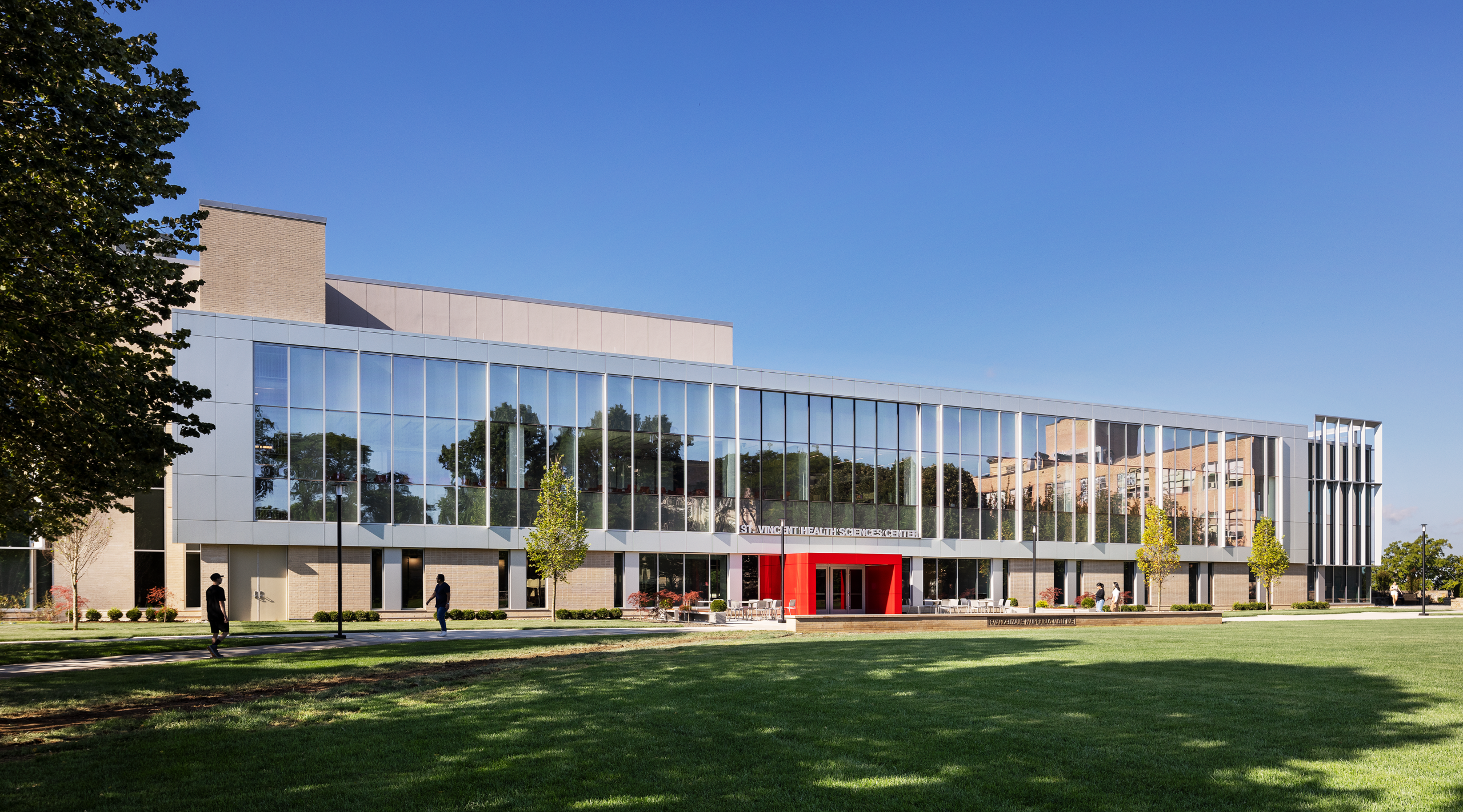 The Health Sciences Center is constructed using sustainable building materials and energy-efficient systems, including our Clearwall® SSI Curtain Wall System, 1600UT System™1 Curtain Wall, Trifab® VersaGlaze® 451T Framing System and our 350T Insulpour® Thermal Entrances, and is expected to earn LEED Silver® certification. Kawneer’s thermal facade solutions were specified for the project to help minimize thermal loss while enhancing the building’s insulation and reducing energy consumption. The windows also feature bird-safe glass to protect local wildlife. Further, the educational facility is equipped with automatic doors to ensure accessibility and ease of movement for all users. These various features all contribute to the building’s modern, sustainable and occupant-friendly design.