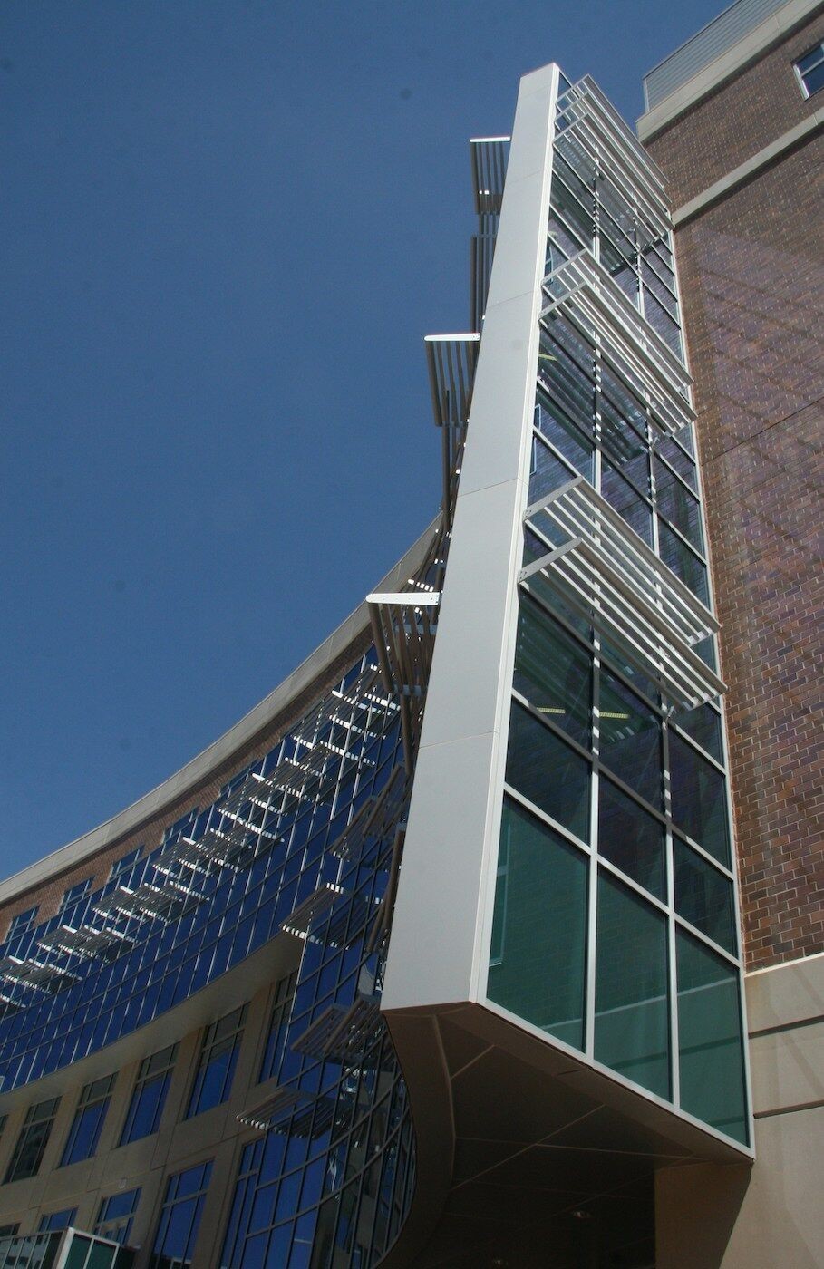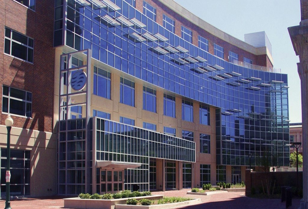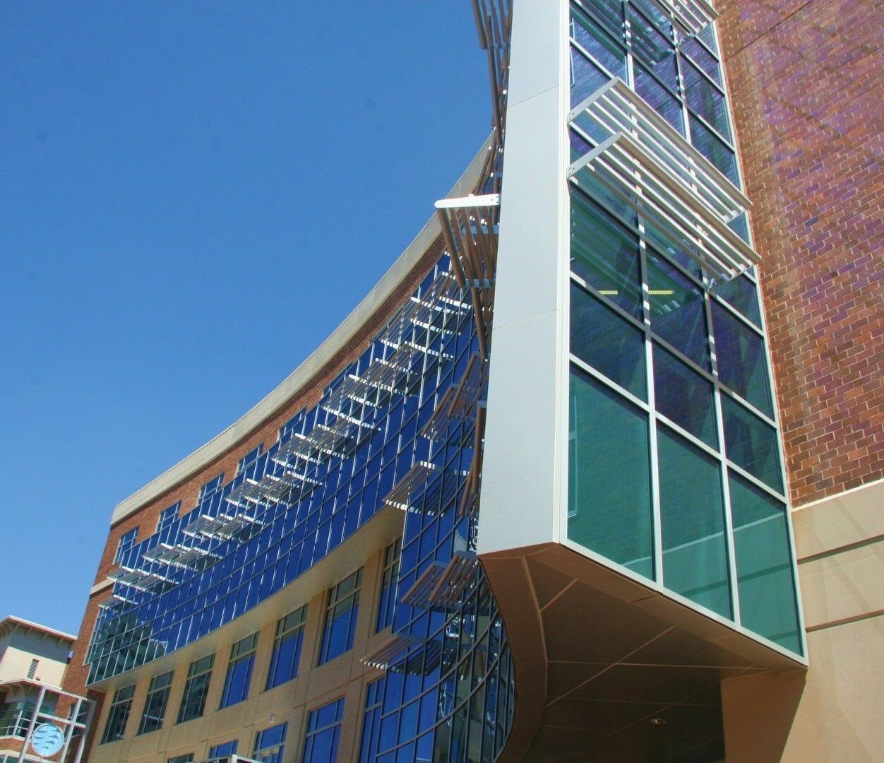 The Tidewater Community College Norfolk Campus Student Center touts a 5-story tall facility with a glass facade. A combination of Kawneer standard and custom curtain wall systems, 1600 Sloped Glazing and 500 Standard Entrances create a monumental visual statement associated with educational buildings.