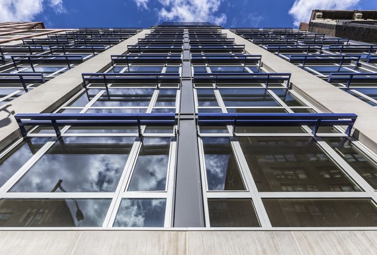 Chelsea Green Condominiums, a recently constructed 14-story building, sets the bar high for a new generation of mixed-use multifamily developments. Featured along with the building envelope, the eye-catching, bright blue Kawneer sunshades allow generous streams of daylight to fill the rooms while reducing solar heat gain. This modern community provides a welcoming space for residents to escape and recharge, all while creating an elegant building façade that is unique and high performing.