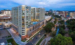 The 16-story Parq on Speer is a mixed-use, urban development in the Golden Triangle neighborhood that is an elevated take on upscale, urban living. Just outside of uptown Denver, the residential tower includes 302 units and 12,000 square feet of retail at the street level anchored by an urban grocery store and coffee shop at one corner and a restaurant at the other. The building features Kawneer’s MetroView® FG 501T Window Wall as well as 1600 Wall System®1 Curtain Wall at the pool level.
