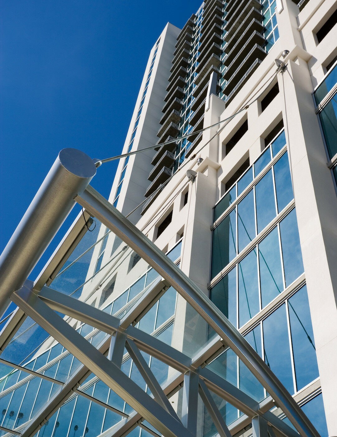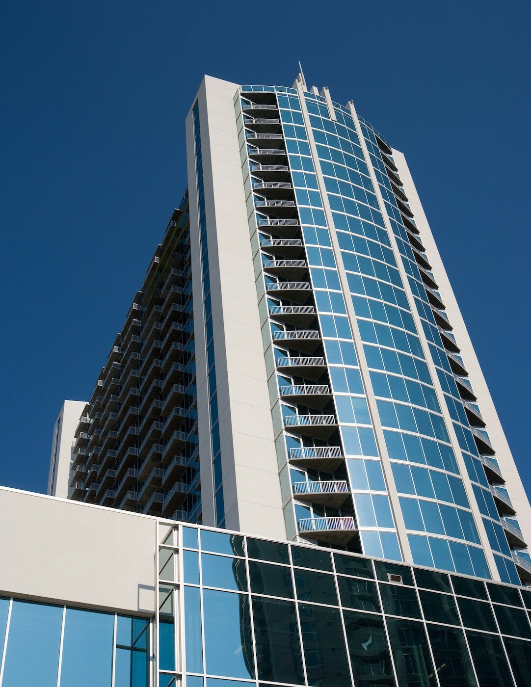 Realm Condominiums features Kawneer’s 1600 Wall System®2 Curtain Wall, GLASSvent® Windows for Storefront Framing, 190/350/500 Standard Entrances and FG 623 Window Wall.